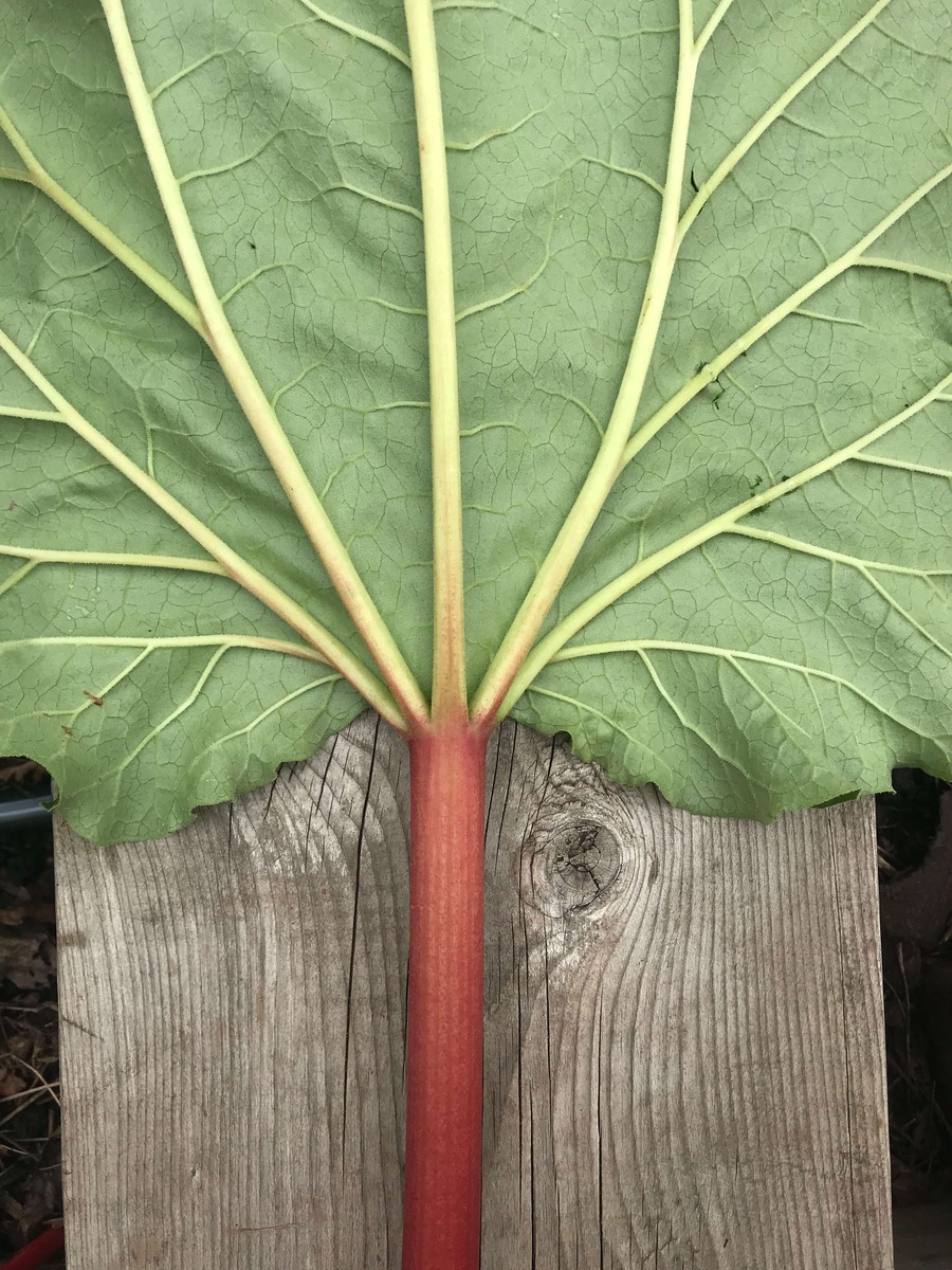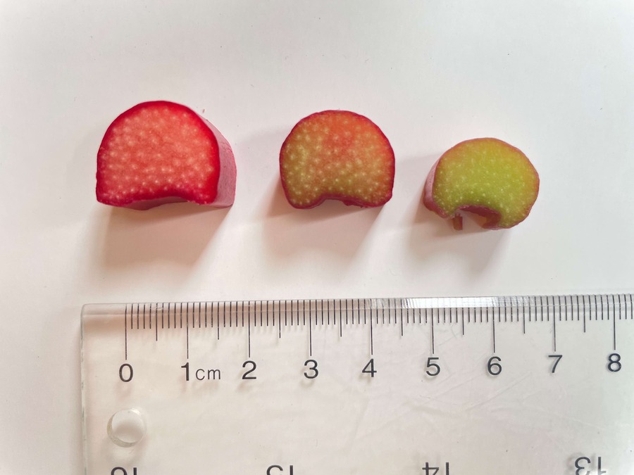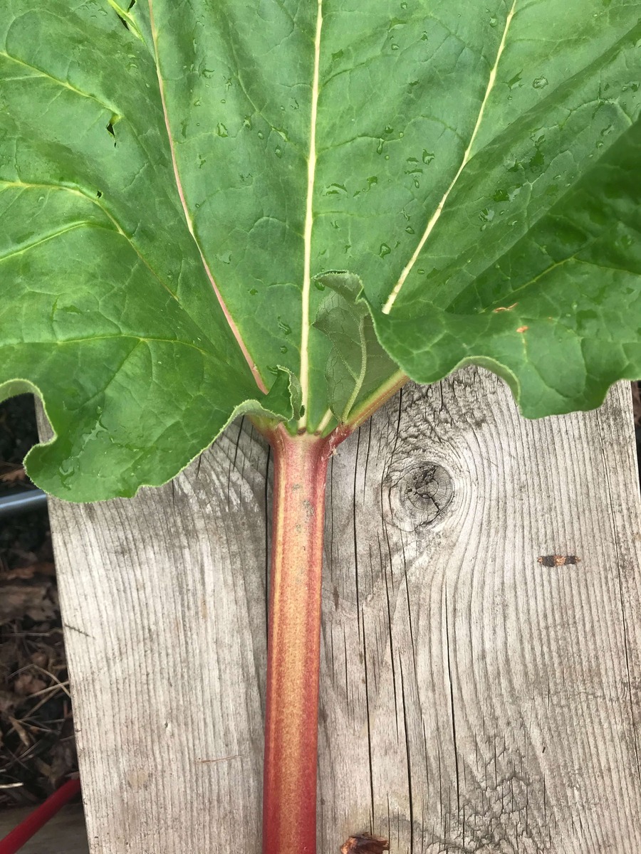 Green petioles, similar to Victoria but slightly more vigorous and more intensely colored, usually with a darker pink speckling on a green stem. Very strong stems suitable for juicing and winemaking.