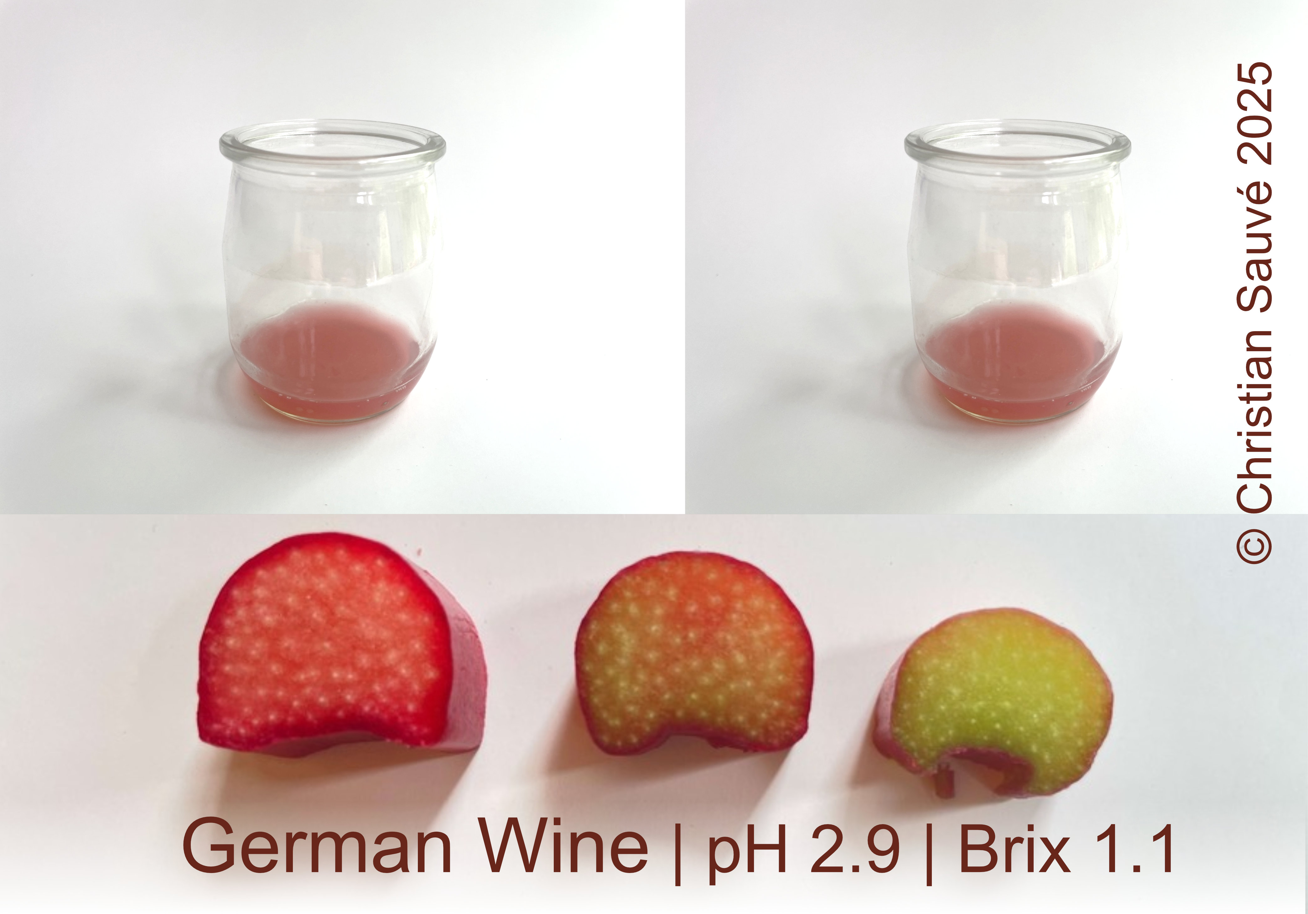 2000 — German Wine is similar to Victoria but is more vigorous and more intense in color, typically with a darker pink speckling on a green stalk.