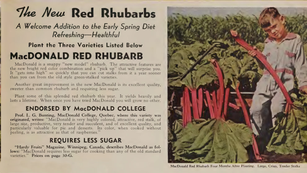 1944 — MacDonald is a snappy "new model" Rhubarb. The attractive features are the new bright red color combination and a “pick up” that will surprise you. It “gets into high” so quickly that you can cut stalks from it a year sooner than you can from the old style green-stalked varieties. Another great improvement in the new MacDonald is its excellent quality, sweeter than common Rhubarb and requiring less sugar. Plant some of this splendid red Rhubarb this year. It yields heavily and lasts a lifetime. When once you have tried MacDonald you will grow no other.