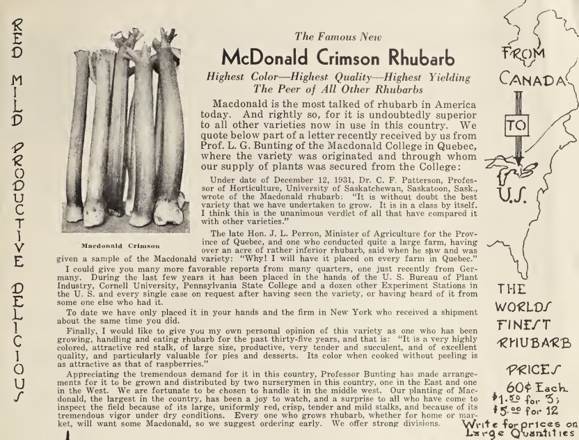 1939 — Macdonald: Originated at Macdonald College, Que. Stalks of good size, juicy, fine-grained; skin deep red, thin; flesh pinkish. The flavor and fibre of the stalks are excellent and when cooked the product is of an It requires less sugar for cooking than any of the attractive Pink color. Old varieties. Sends up seedstalks but seems to produce only a little seed.