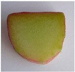 2021 — Semi-erect attitude, type of cross-section 1, green ground color of skin, entire distribution of skin superimposed color at base, absent distribution of skin superimposed color at middle, absent distribution of skin superimposed color just below leaf blade, present hairiness just below leaf blade, absent or very weak ribbing of dorsal side, green color of flesh.
