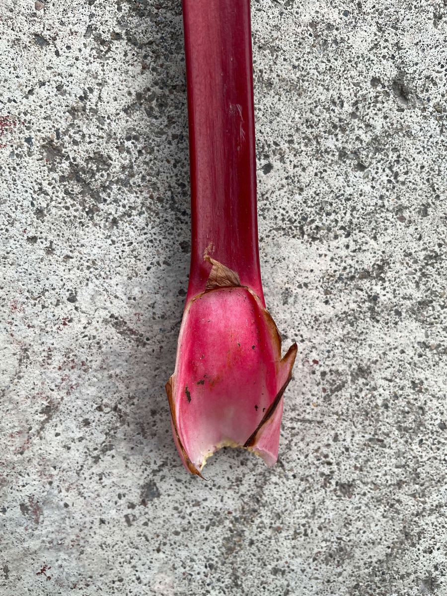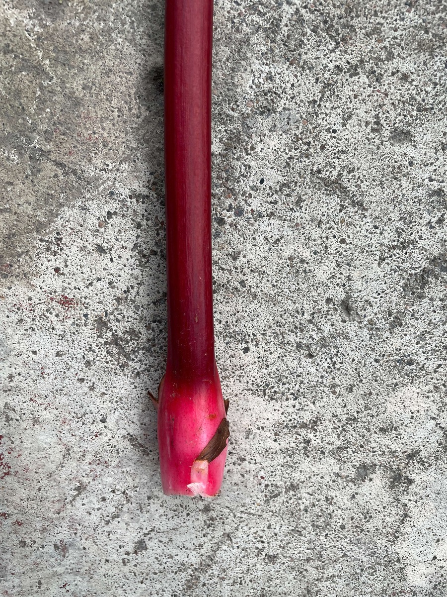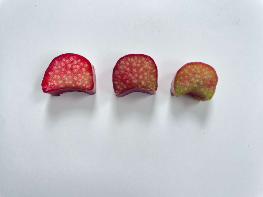 Once cooked, the stems retain their shape and produce a bright, light pink liquid. Fragrant, leafy and sweet aroma. Tender, moist but firm and had a slight rhubarb taste, slightly sour and slightly bitter.